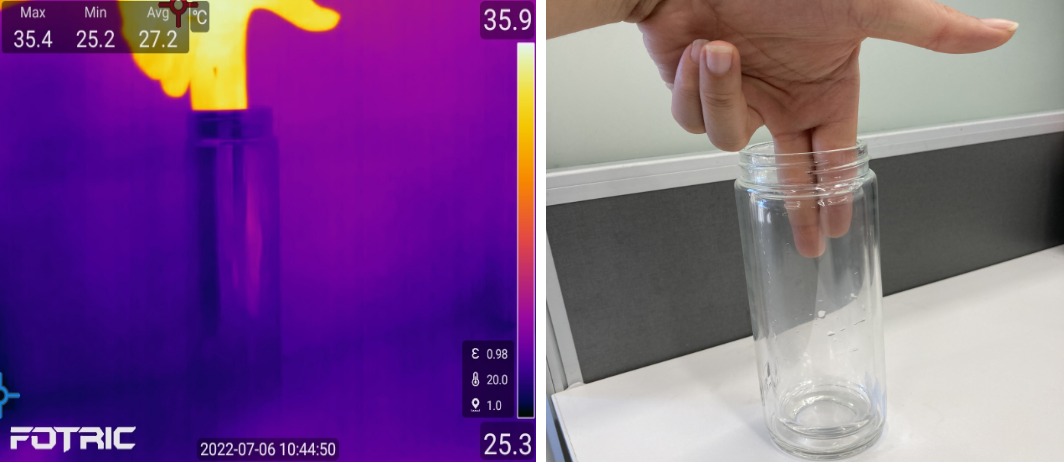 En la termografía la longitud de onda es diferente del espectro visible por lo que si quisiéramos ver en el interior de una botella de cristal o un cristal de una ventana nos encontraríamos con problemas de emisividad puesto que ambos objetos son de vidrio y reflejan el calor de los elementos que se encuentran en su entorno, por ejemplo si sacáramos una imagen termográfica de una ventana que tuviéramos enfrente veríamos que contra nuestra figura se refleja en la misma comportándose un cristal trasparente en el espectro visible como espejo en el espectro infrarrojo, lo que tú consideras que es transparente en el espectro visible se comporta como un espejo en el espectro del infrarrojo