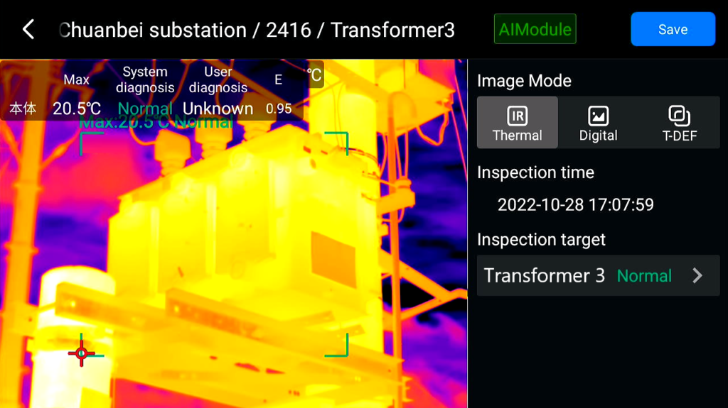 La cámara permanece en el seguimiento del objetivo con una guía paso a paso que vincula las imágenes a los activos de inspección mejorados por el reconocimiento de objetos y coincide con las reglas de diagnóstico al disparar. La ruta guía al inspector para recopilar imágenes y datos de manera estructurada. Durante una inspección, el cuadro verde apareció en la pantalla cuando la cámara térmica reconoció el activo objetivo en el campo.