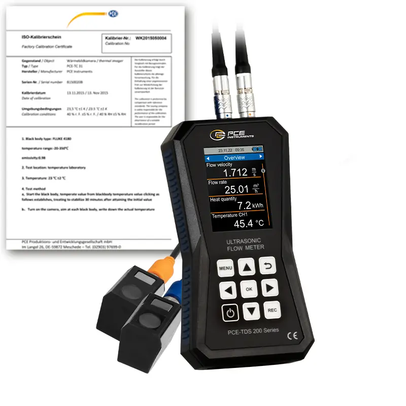 Caudalímetro ultrasónico con memoria de 32 GB / Rango: ±32 m/s / Reproducibilidad: ±0,5 % del valor de medición / Diferentes sondas disponibles / Alarma / Pantalla LCD de 2,8" / Para cualquier medio / Certificado de calibración ISO incluido