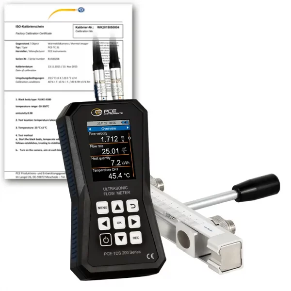 Caudalímetro ultrasónico con memoria de 32 GB / Rango: ±32 m/s / Reproducibilidad: ±0,5 % del valor de medición / Diferentes sondas disponibles / Alarma / Pantalla LCD de 2,8" / Para cualquier medio / Certificado de calibración ISO incluido