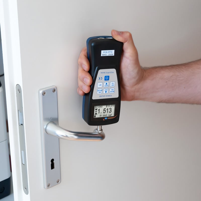 El dinamómetro es un dispositivo de mano y digital para medir fuerzas de tracción y compresión. El dinamometro trabaja con una frecuencia de muestreo de 500 Hz. Dispone de diferentes modos de medición como medición en tiempo real (RT), medición valor pico (PEAK), una medición promedio configurable (Average) y un registro de datos automático de hasta 100 mediciones.