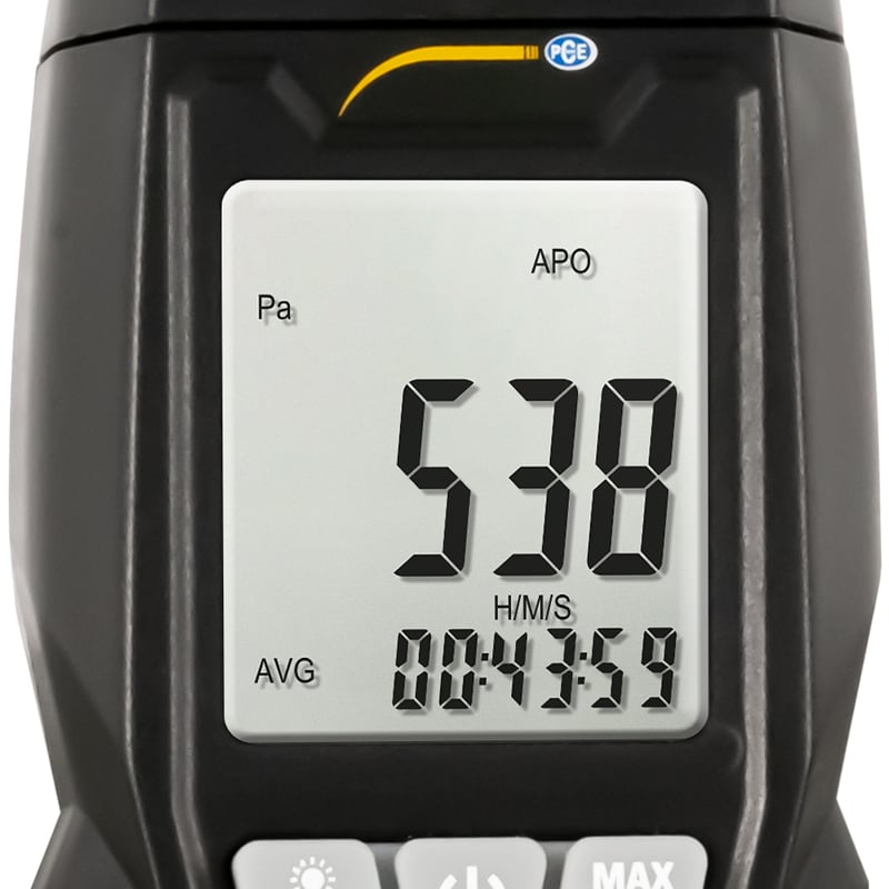 El manometro le muestra el valor actual y también el valor promedio mínimo y máximo. Esto facilita el análisis de los valores de medición. Para aumentar la autonomía de las pilas el manómetro se desconecta automáticamente tras 5 minutos de inactividad.