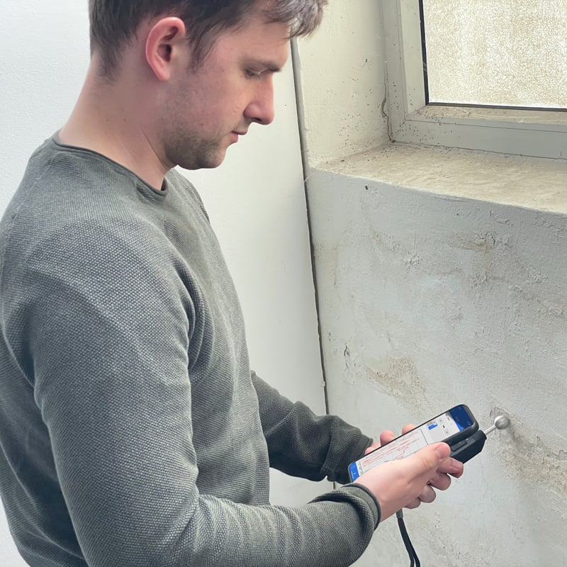 Medidor de humedad en paredes con interfaz Bluetooth / Rango: 0,0 … 100,0 % / Diseño pequeño y compacto / Exportación de datos en in .csv, .pdf, .jpg / Funcionamiento con pilas / Determina la humedad de diferentes materiales