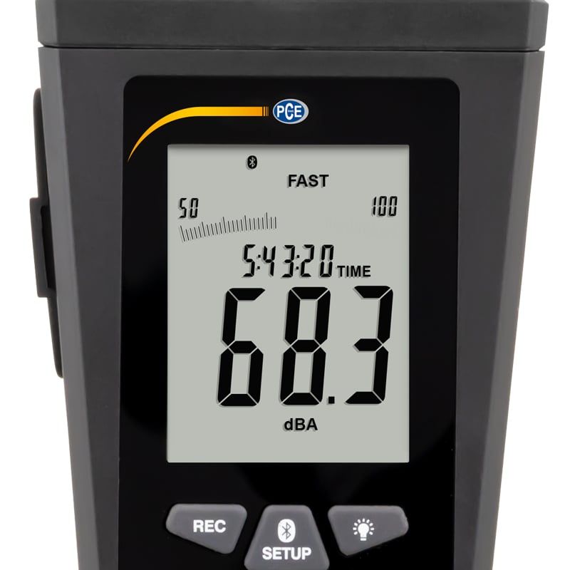 El sonómetro Bluetooth mide el ruido en un rango de 30 … 130 dB y se puede usar en aquellos lugares donde sea necesario detectar una fuente de ruido. El sonometro Bluetooth se utiliza por ejemplo en el control de ruido laboral en el prensas, sistemas de ventilación o también en carreteras de mucho trabajo para el control de ruido ambiental. Con la simple pulsación de una tecla puede cambiar la ponderación de frecuencia entre A y C del sonómetro Bluetooth. La función de registro de datos del sonómetro Bluetooth permite registrar hasta 32 700 valores. Además, para colocar y orientar adecuadamente el sonómetro Bluetooth se puede montar sobre un trípode.