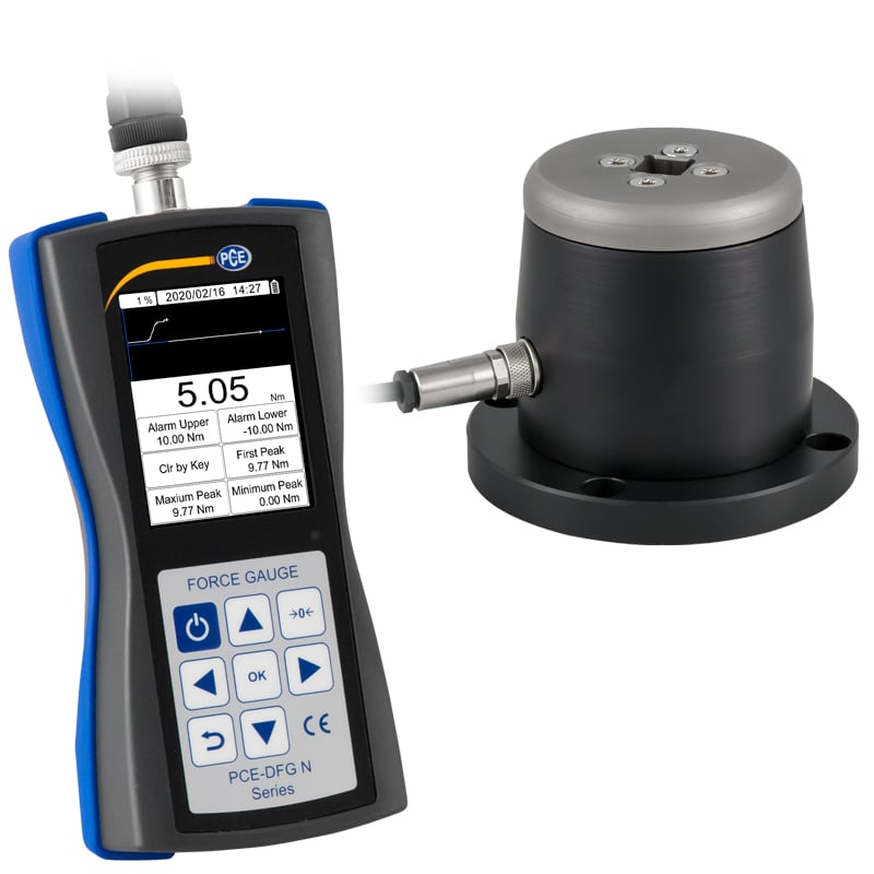 El torquímetro se compone de un dispositivo de mano y un sensor de torque externo. El sensor de torque se conecta con el torquimetro a través de un cable de 1,5 m, lo que permite la instalación en una máquina de ensayos o el montaje directo en una mesa de prueba.