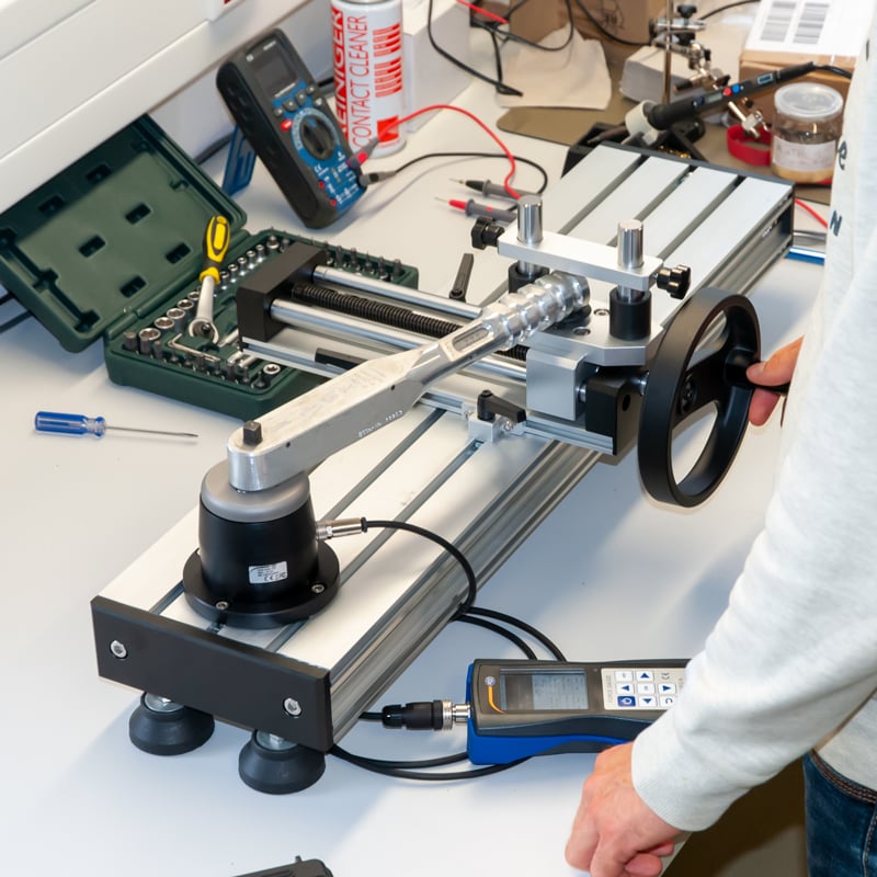 Enviamos el torquímetro ajustado de fábrica, lo que permite al usuario poder realizar mediciones nada más recibirlo. Opcionalmente puede solicitar para este torquímetro un certificado de calibración ISO. Esta certificación es una comparación entre unos valores nominales y reales. Para ello se utiliza un patrón trazable, lo que permite comprobar la precisión del dispositivo. La incertidumbre del torquímetro es de sólo 0,5 % del fondo escala. Gracias a ello puede usar este torquímetro como dispositivo de referencia en el control y ajuste de medidores de torque estáticos. Para medir momentos de torque dinámicos es imprescindible usar una unión atornillada.